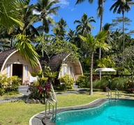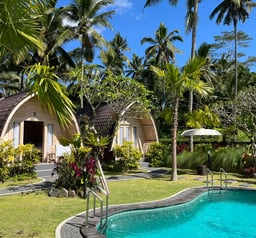 Private resort with 3 wooden "lumbung" houses, private swimmingpool, rice field vieuw and central kichen for shared use.